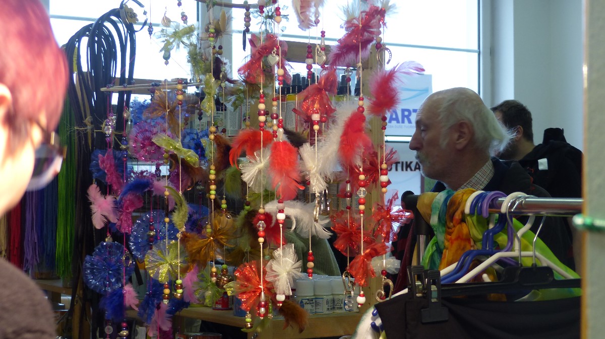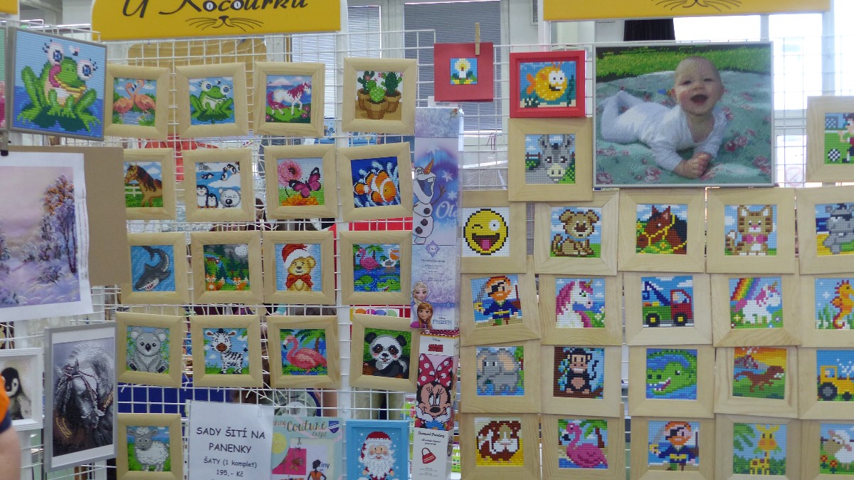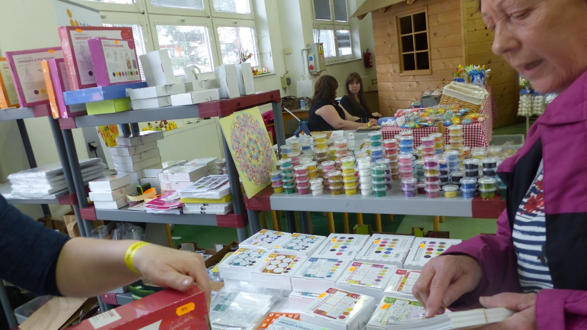 Stánek s barevnými písky, předlohami a sadami na pískování
