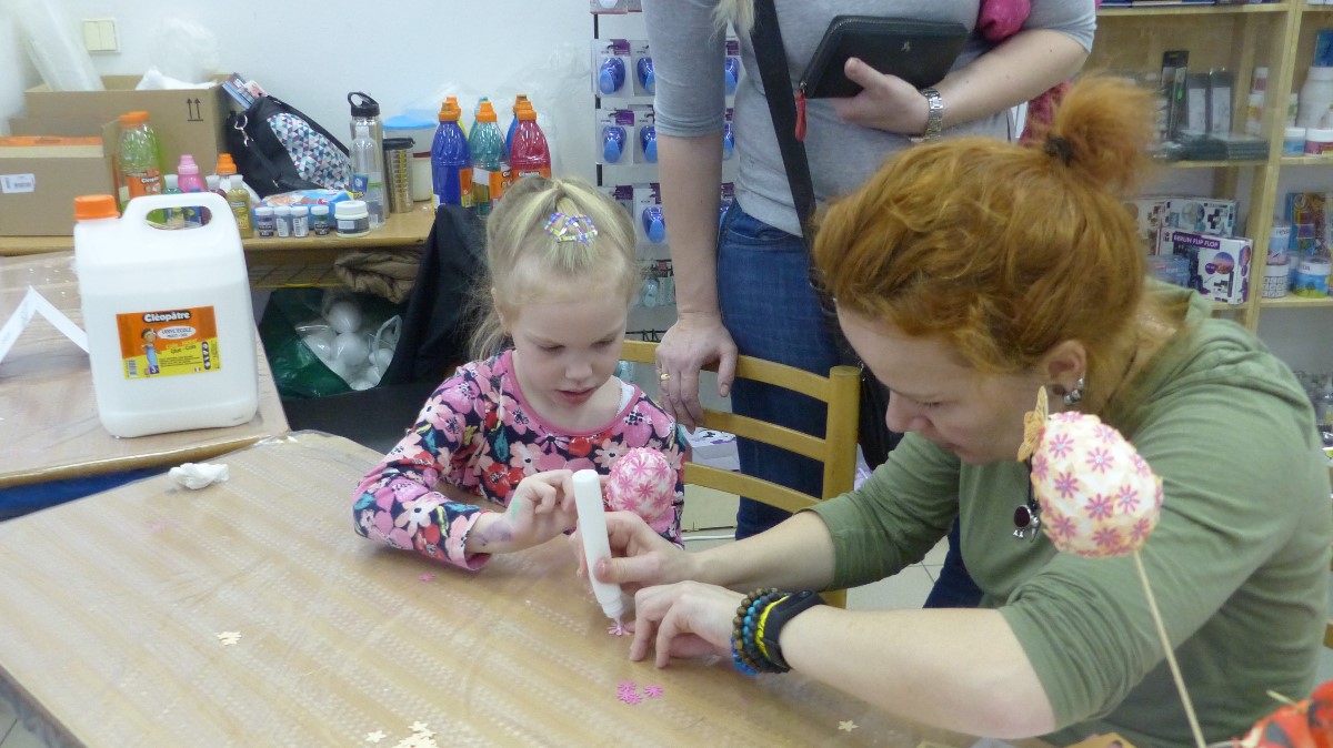 Holčička se pokouší lepením ozdobit kraslici
