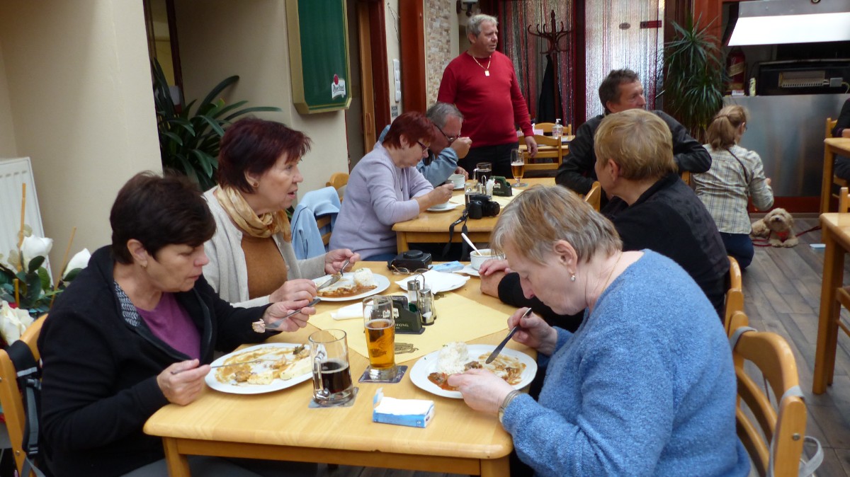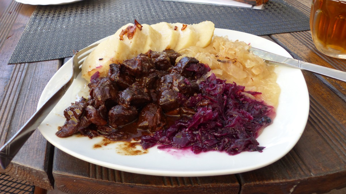 S Vlastou jsme si pod hradem daly kančí maso se zelím a bramborovými knedlíky. Bylo to vynikající, moc jsme si pochutnaly