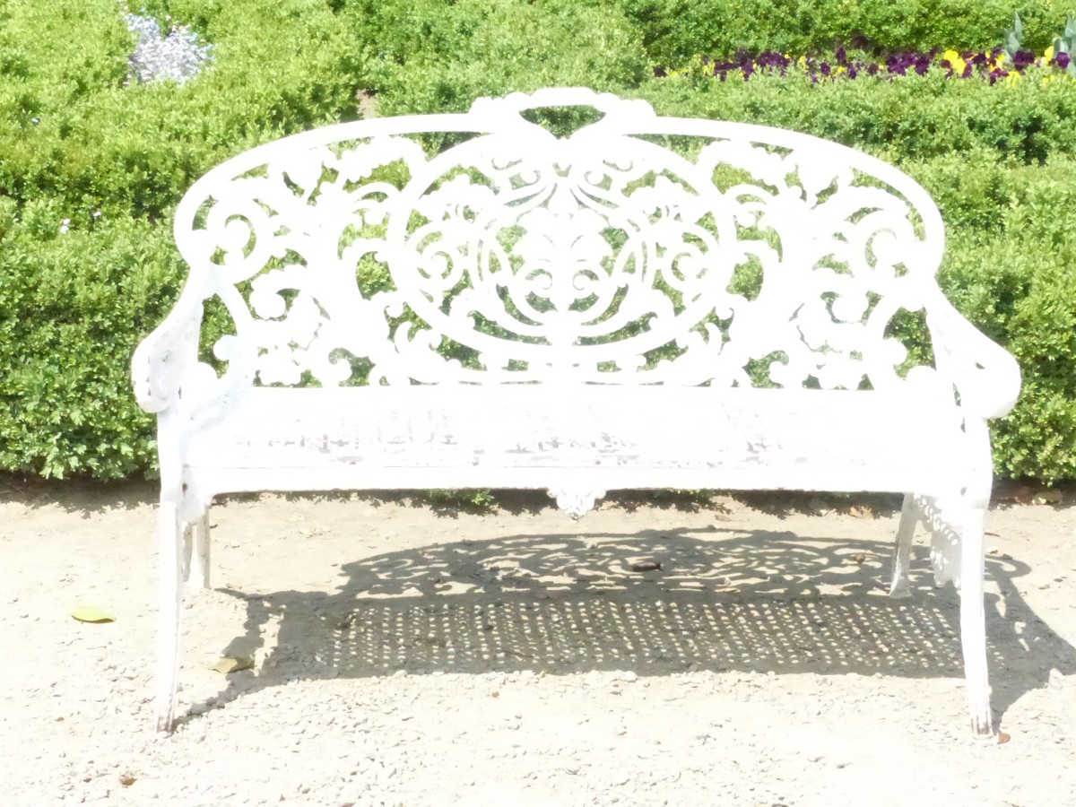 Jedna z laviček v Květné zahradě v Kroměříži