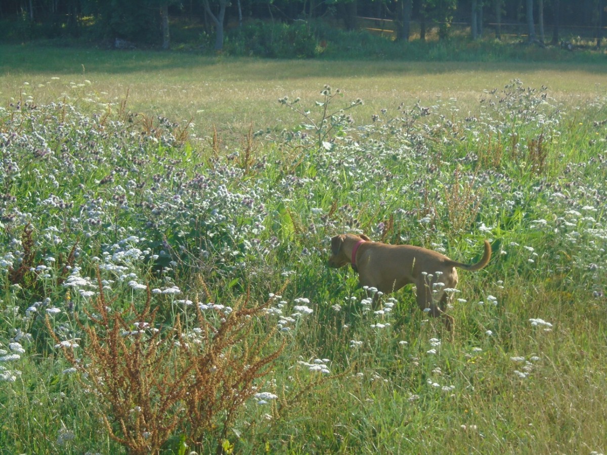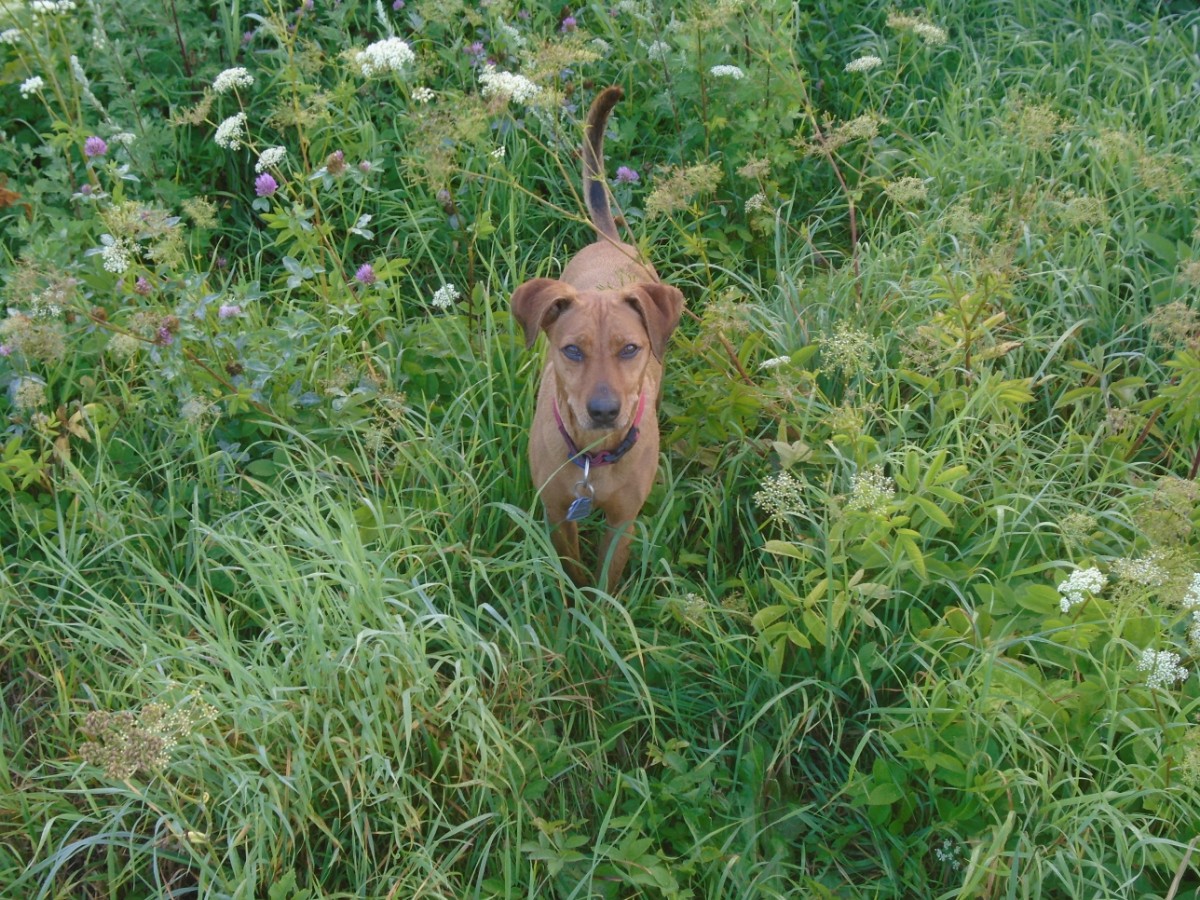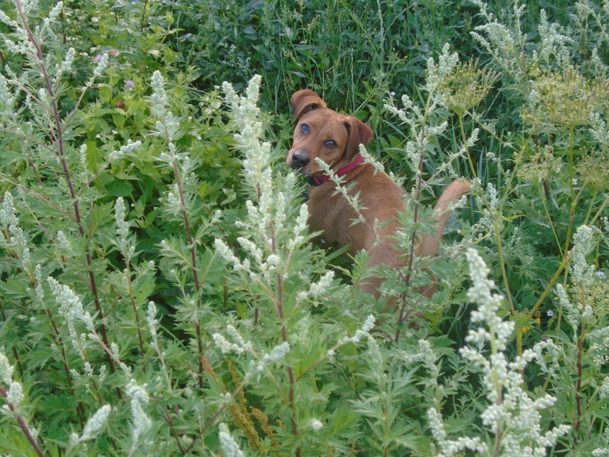 Musím hezky sedět na místě, bábinka mi šla schovat do trávy piškot.