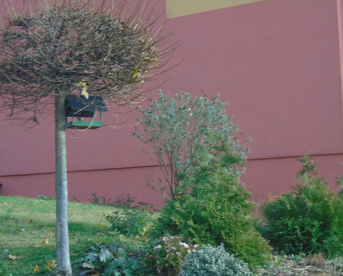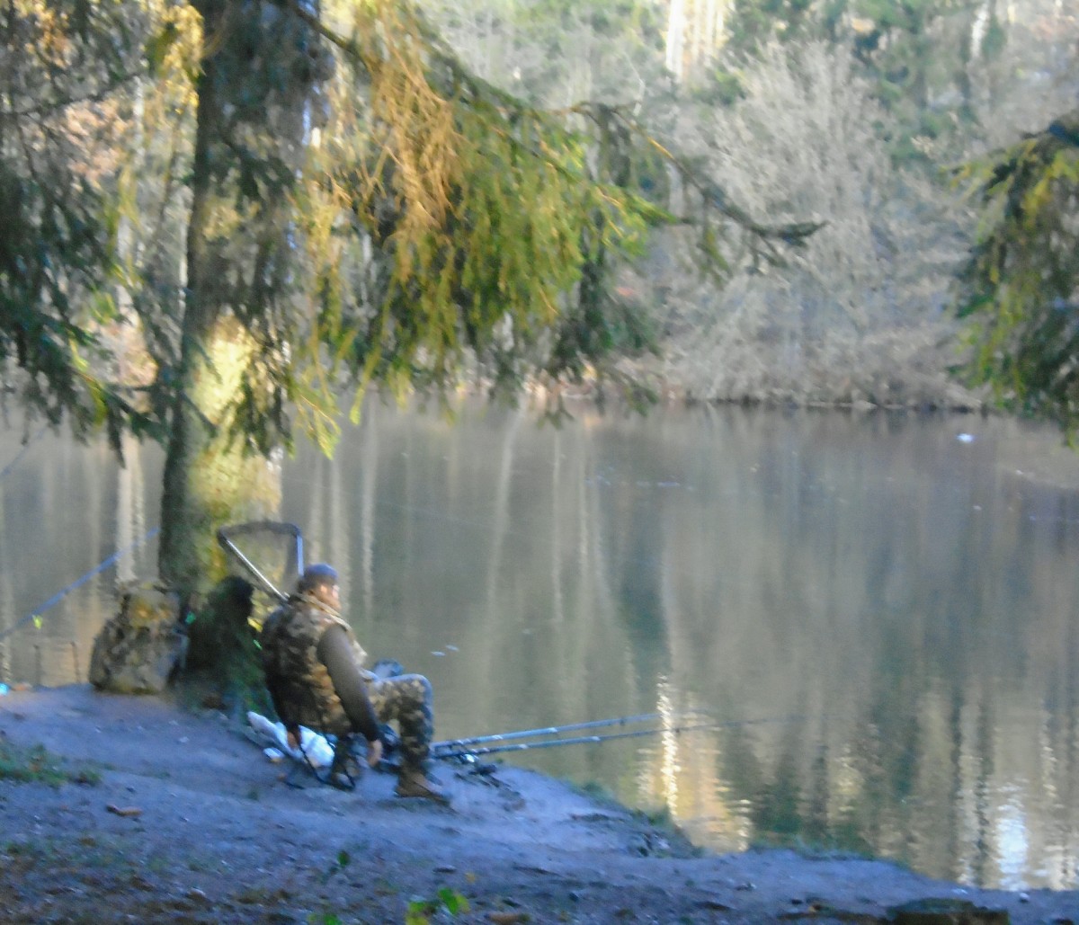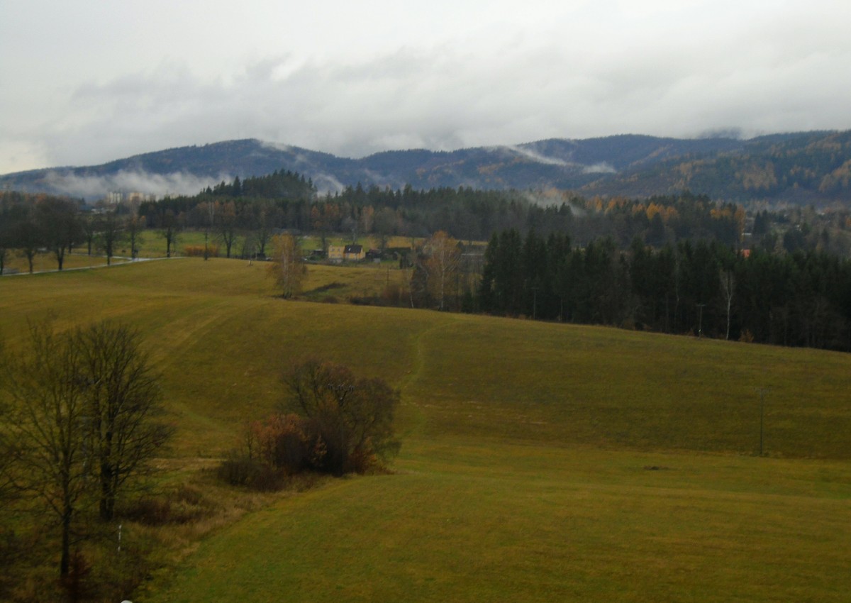 Pohled z okna k lesu, oblíbený cíl procházky. Dole v břízách začínají tři rybníky.