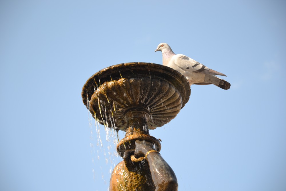 Foto: J.Vítek Hlava bronzové sochy,pítkona vodu s živou holubicí.
