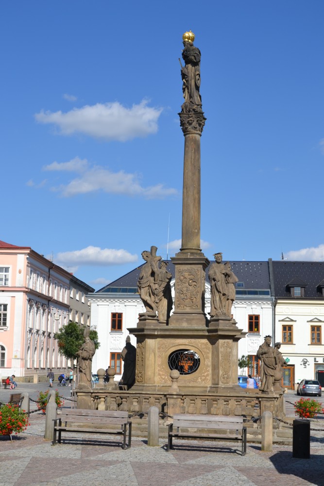 Foto:J.Vítek Morový sloup i s věží kostela.