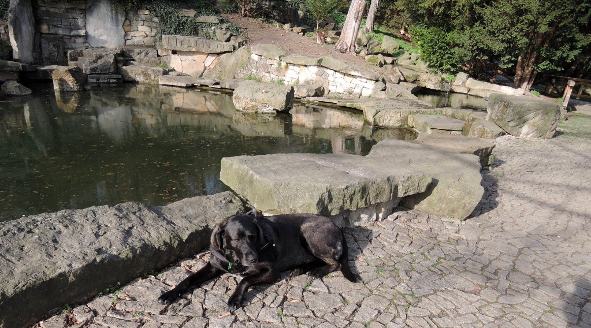 Pejsek se vyhřívá na sluníčku u jezírka
