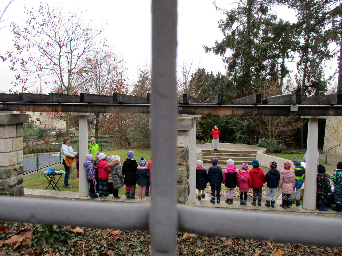 Děti z MŠ nacvičovaly na zahradě koledy na vánoční besídku