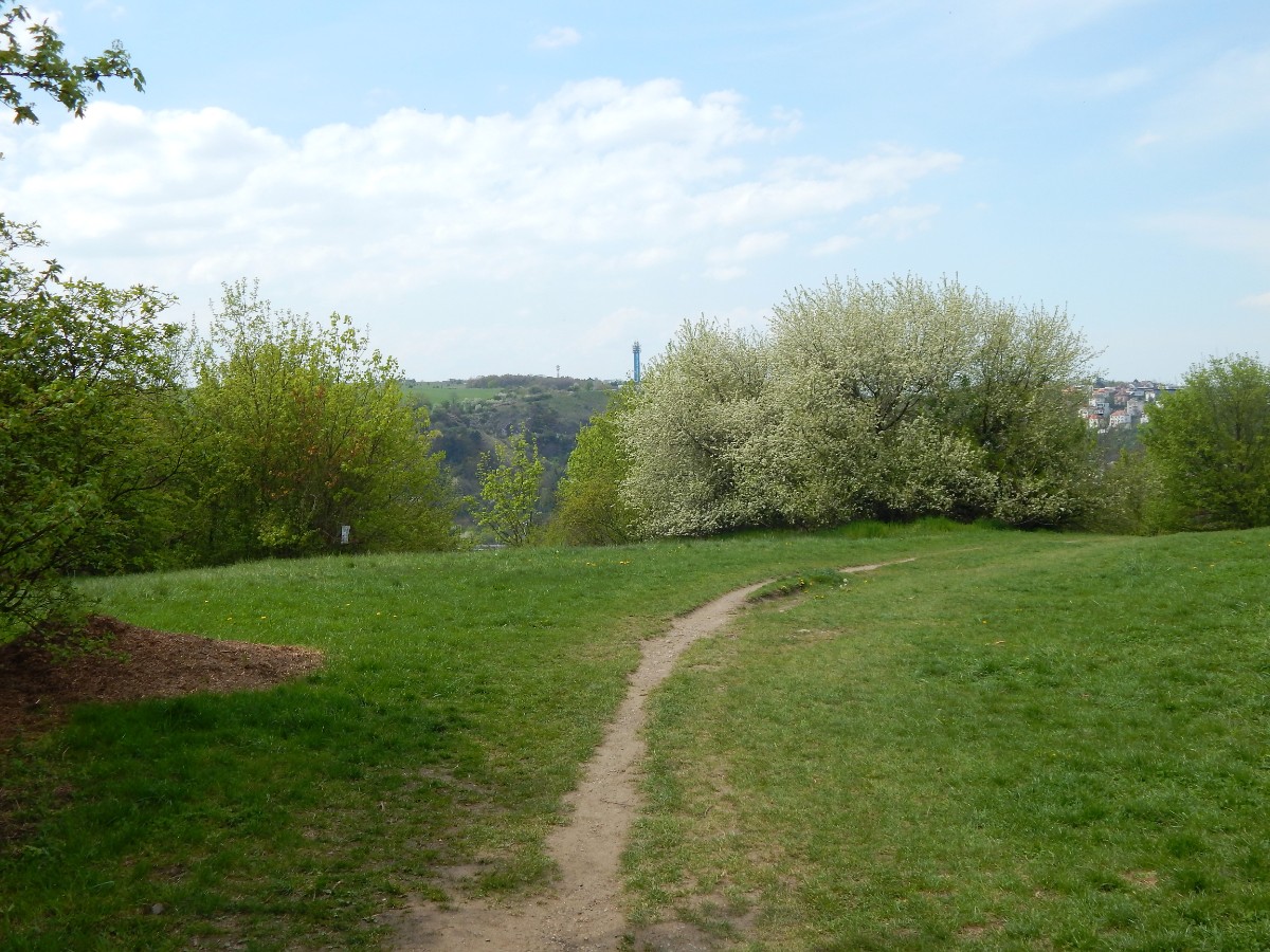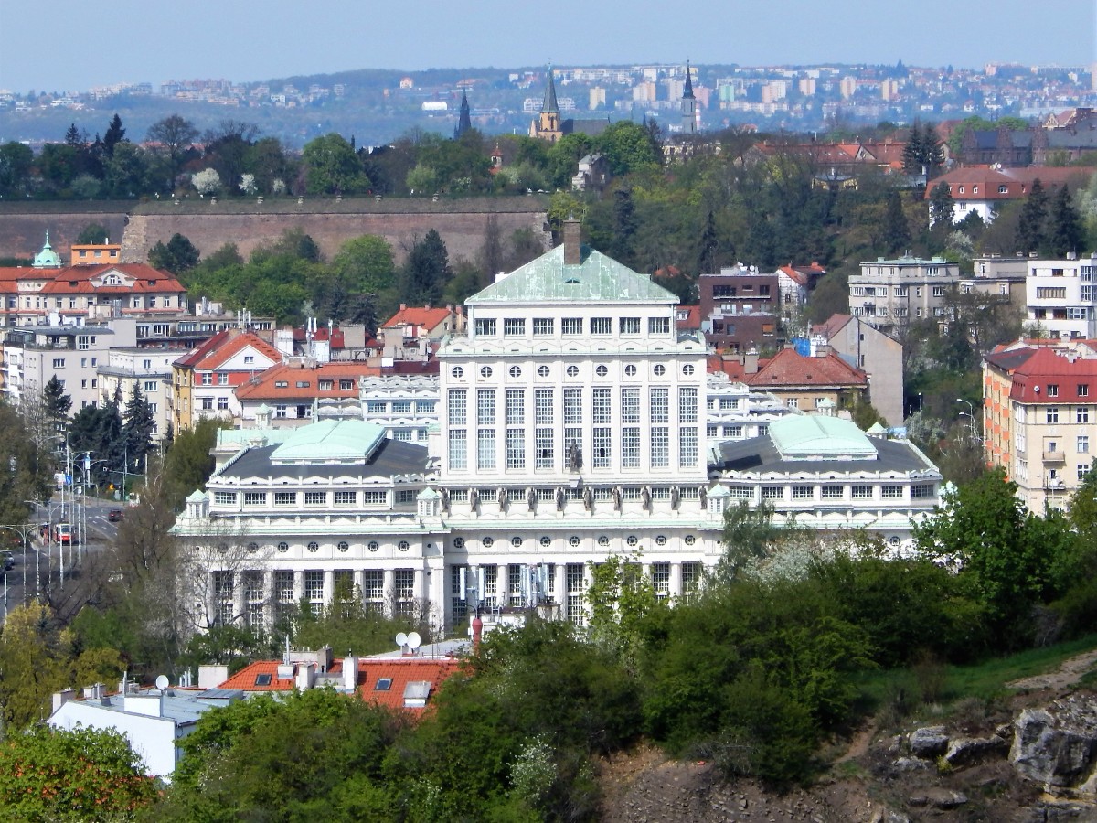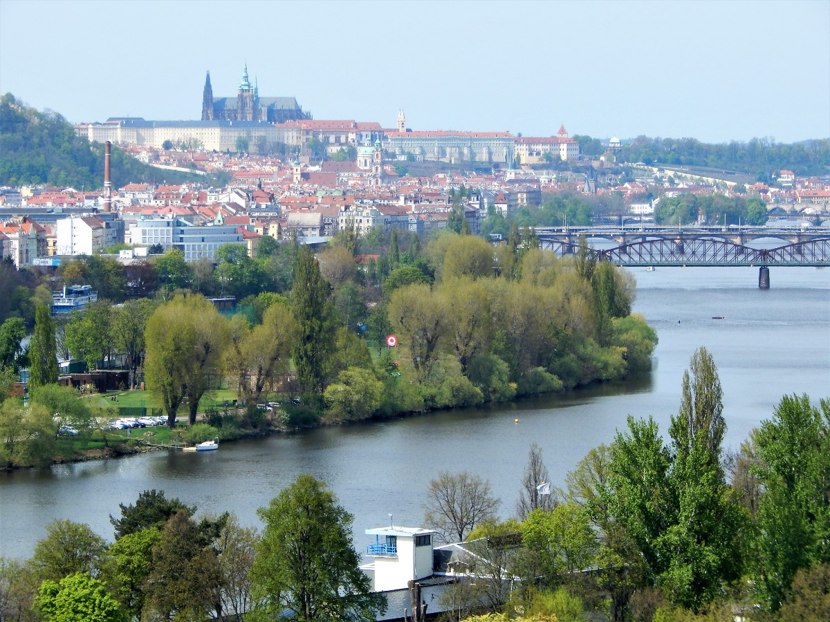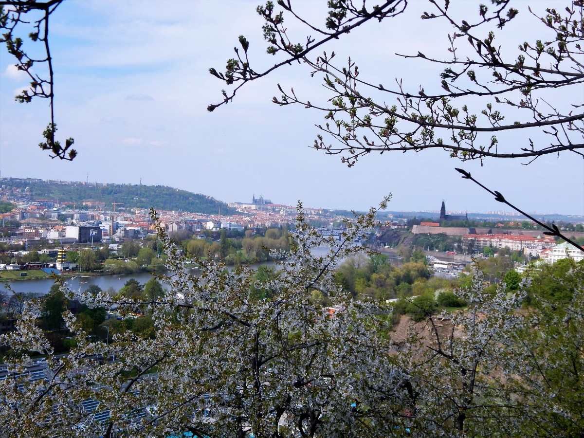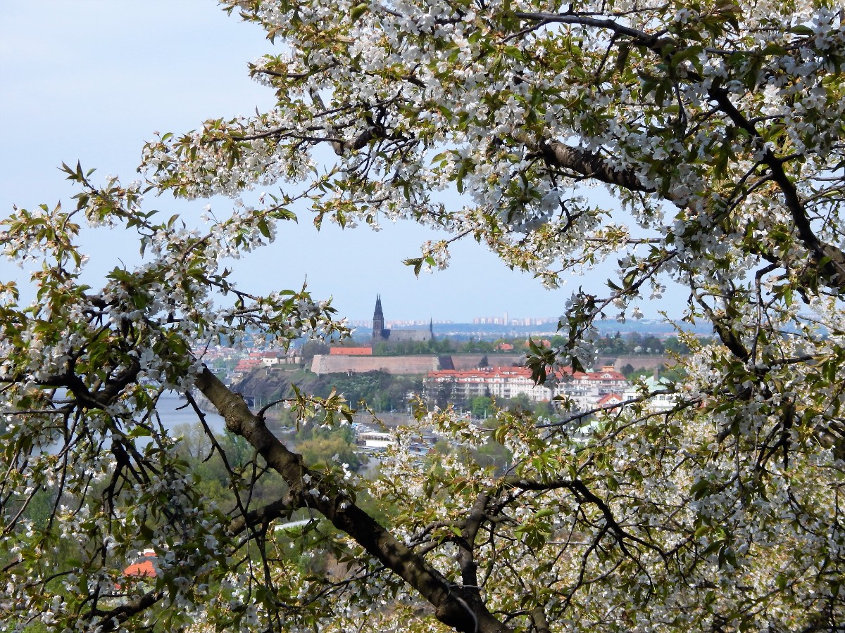Pohled na Prahu od rozkvetlých stromů