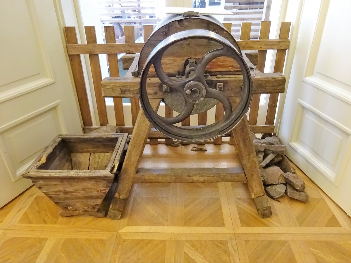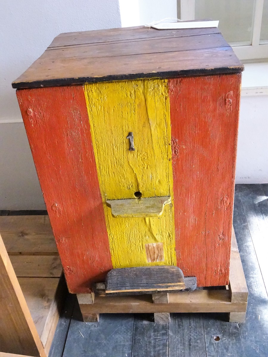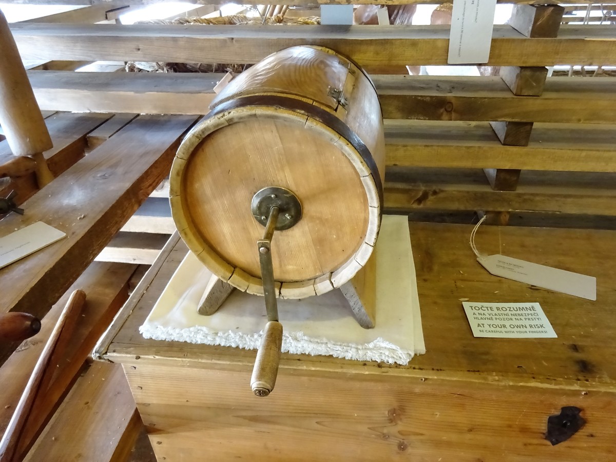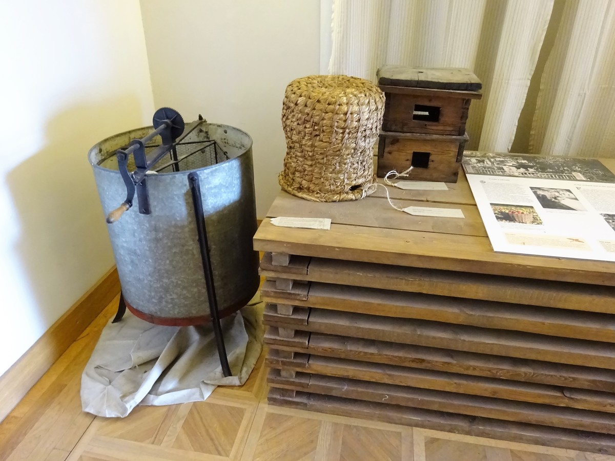 Medomet. Základ z 30. – 40. let 20. století. Nová Včelnice, okres Jindřichův Hradec. Slouží k oddělení medu z pláství pomocí odstředivé síly. Roku 1865 jej vynalezl rakouský voják a včelař Franz von Hruschka. Včelí úl upletený ze slámy. Přelom 19. a 20. s