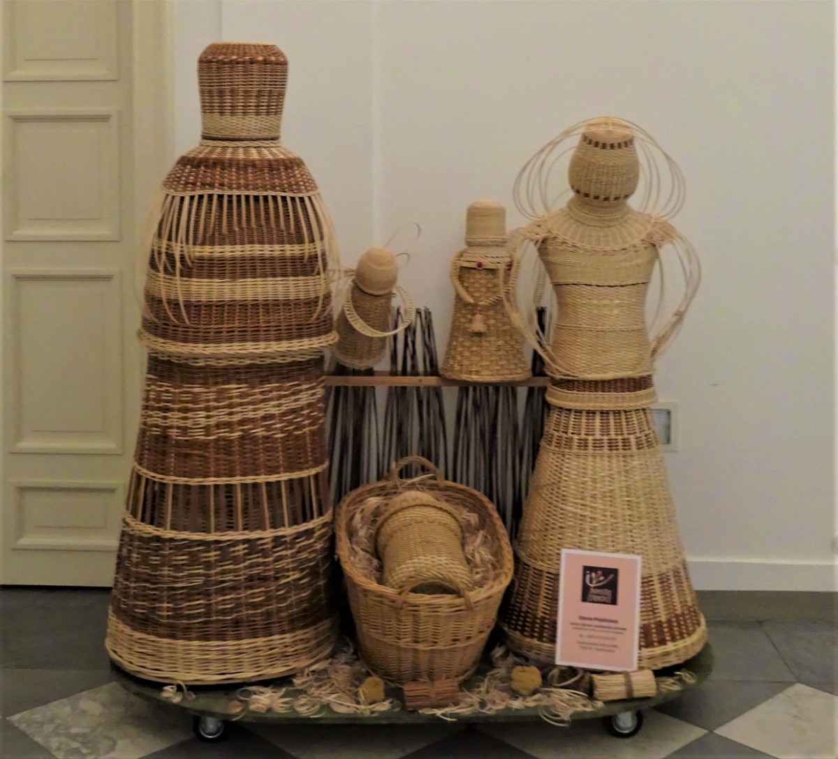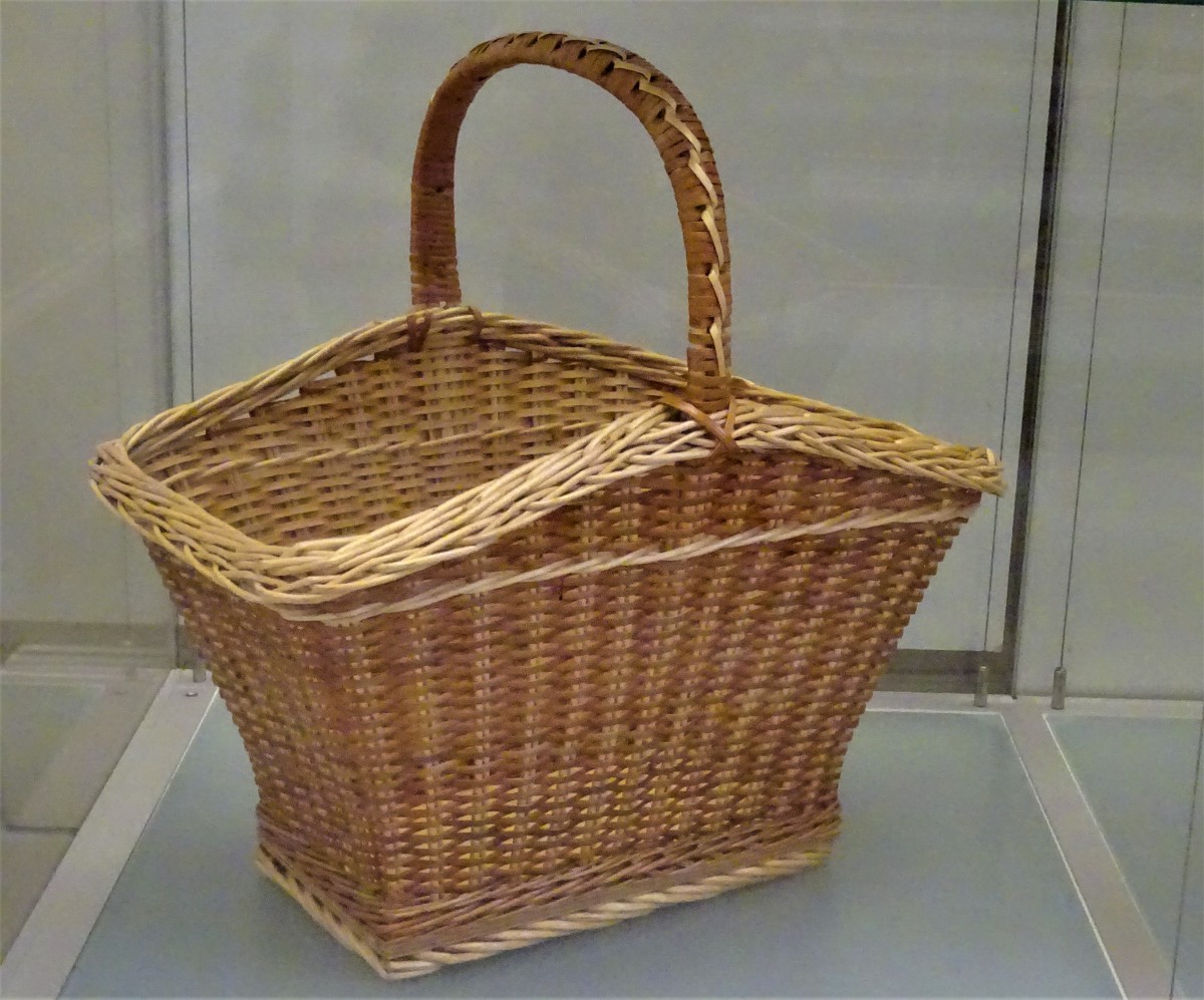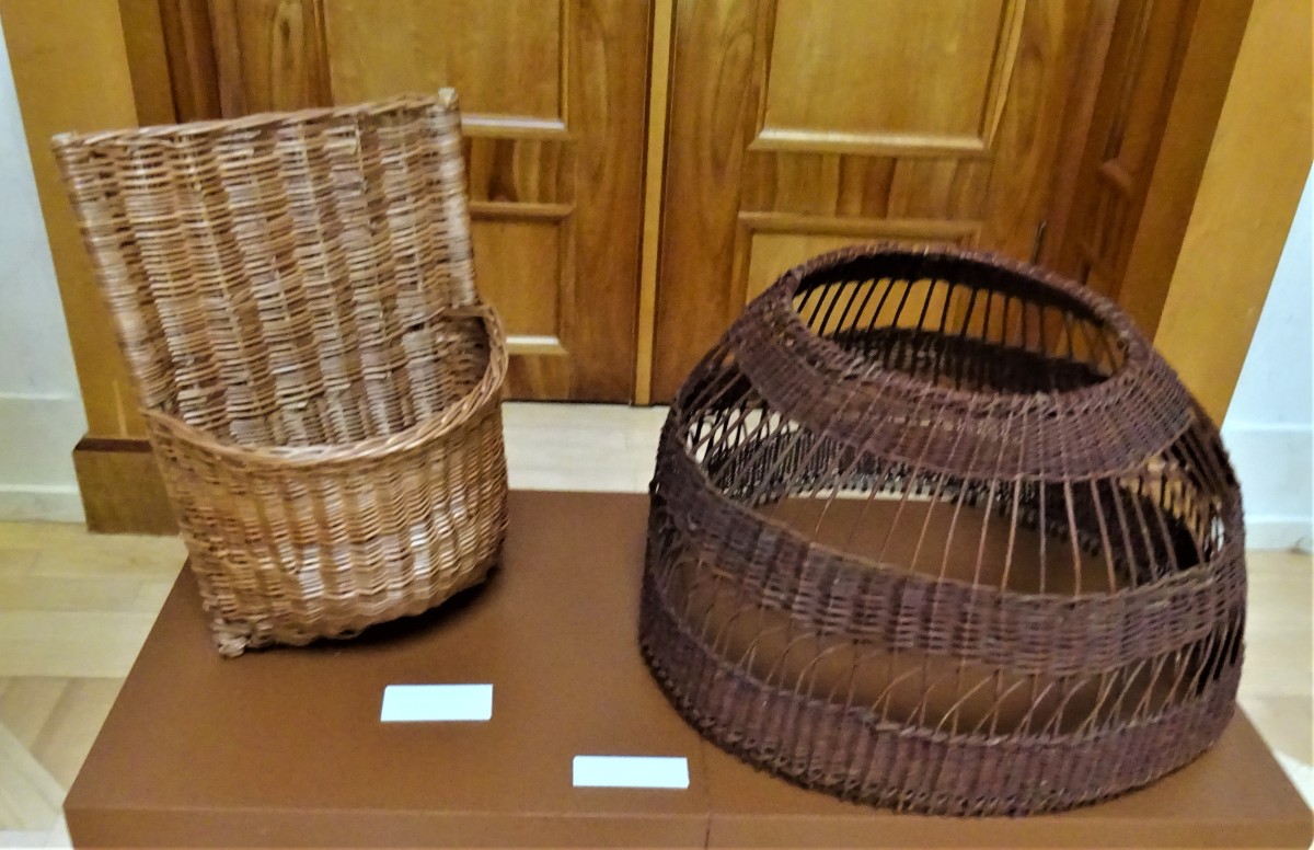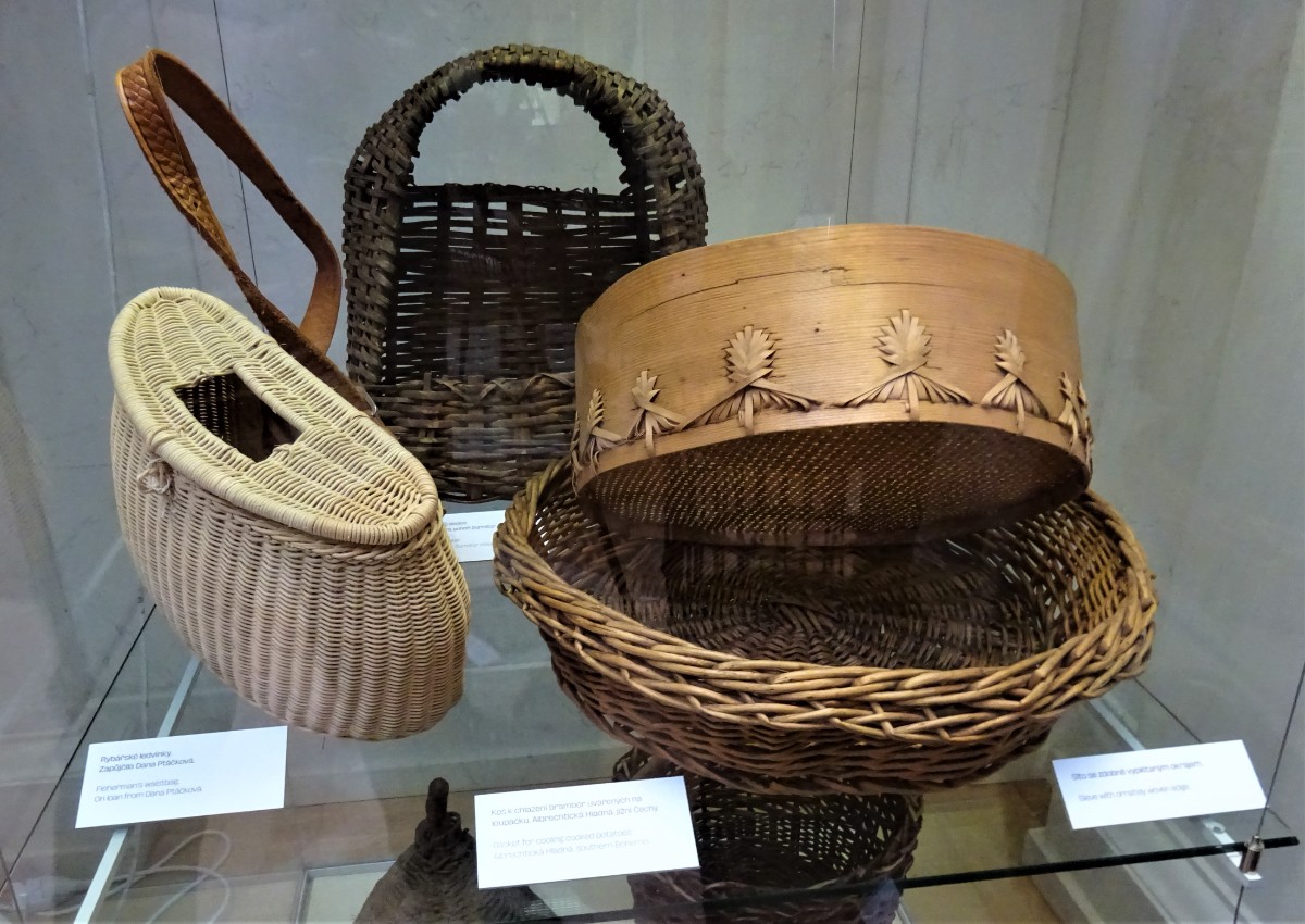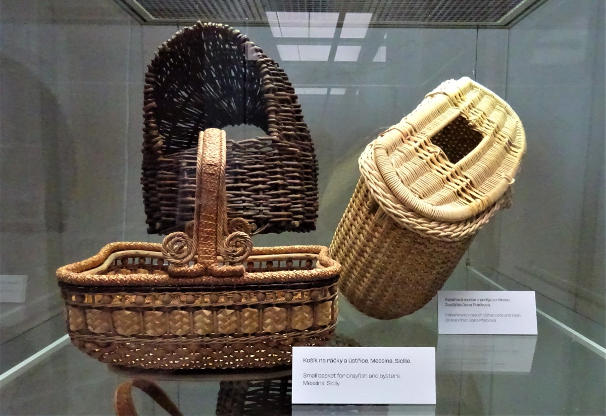 Kukaň pro slepice. Rybářské ledvinky. Koš k chlazení brambor uvařených na loupačku. Síto se zdobně vyplétaným okrajem.