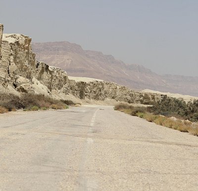 Na krajnici se objevují tabule se zápornými čísly. Tyto výškové (nebo spíše hloubkové) značky nám připomínají, že klesáme pod hladinu světových oceánů. Teplota stoupá a krajina jako by se vypařovala v bělavém oparu. Vzduch se tetelí horkem, které nepřichází shora od slunce, ale zdola ze země. Kamenité svahy jsou vyprahlé, beze stínu a známek života. Objevují se solné mapy na skalách, bílé šmouhy připomínající popel. Máme zvláštní dojem, že nesjíždíme k moři, ale kamsi do nitra Země. Po levé straně silnice se objevuje údolí Ma’in s horkými prameny. Jsme jen pár desítek kilometrů od Ammánu, ale máme pocit, že jsme se ocitli na jiné planetě. Během další části trasy k Mrtvému moři se silnice nejprve zvedá z úzkého kaňonu Ma’in. Krajina se rozevírá, silnice se stáčí směrem k Mrtvému moři. V dálce se objevuje široká, šedobílá plocha. Nejdříve to vypadá jako mlha, pak jako voda a následně se to znovu rozplývá. Jedeme k něčemu, co není příliš dobře vidět, ale cítíme to v nose i na pokožce. Slanost, vlhkost, těžký vzduch. Znovu se objevují tabule se zápornými čísly. Míjíme nápisy „-200 m“, „-300 m“, a nakonec i „-400 m“. Uvědomujeme si, že se ocitáme v nejnižším bodě na souši naší planety. Hladina Mrtvého moře je zhruba 440 metrů pod hladinou světového oceánu. Když se silnice konečně přiblíží k pobřeží, opar se rozestoupí a objeví se pás modré vody.